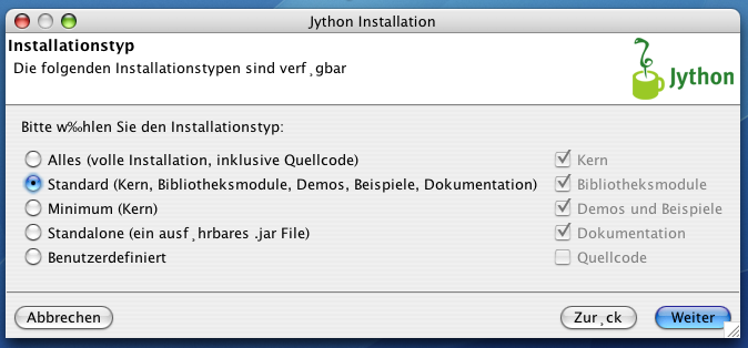 Charlie, could you please check if the file installer/src/java/org/python/util/install/TextConstants_de.java in your local repository differs from the one in the full_build_*/checkout directory? If yes, please send me both, if no, please send me one of them. I suspect that the 'Umlaute' were converted somewhere on the way between my checkin and your checkout.